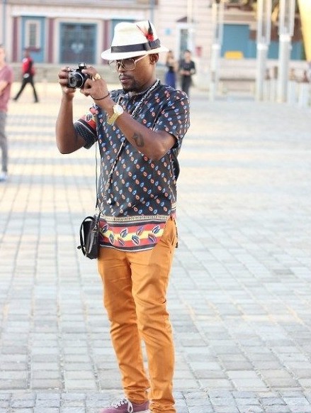 民族风的印花Polo衫,搭配上羽毛帽子和亮色裤子,就显得休闲又有特色
