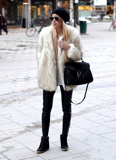束腰皮草外套避免臃肿,用黑色紧身裤搭配粗跟踝靴x38服装批发市场网