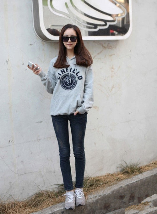 灰色运动卫衣搭配浅色牛仔裤3Kn服装批发市场网