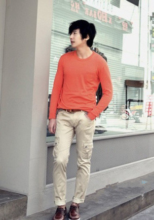 舒适休闲的搭,西瓜红色的圆领T搭配浅米色工装裤,很阳光的气质BUy服装批发市场网