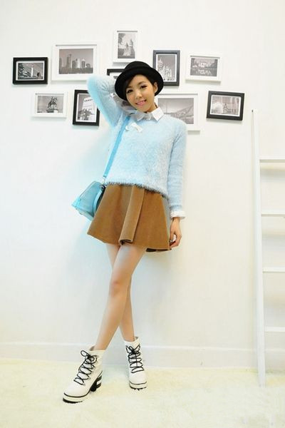 冰淇淋色的海马毛衣搭配白色马丁靴